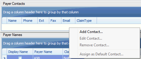 - Set as Default Contact - Designates the highlighted contact as a default contact. This can be designated through the context menu or by clicking the Default checkbox on the Payer Contacts grid.